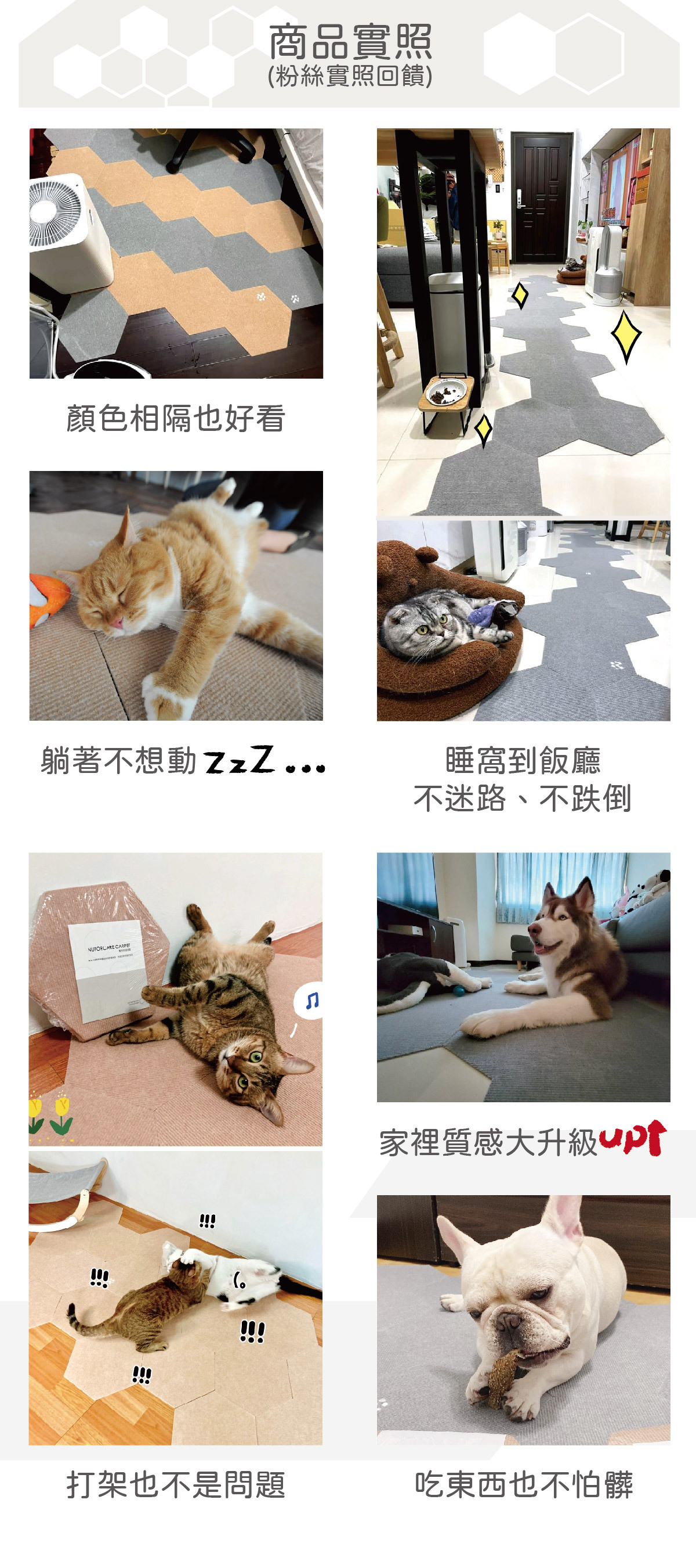 一般地板都可以貼,只要不是像柏油路一樣的凹凸不平,地墊都可以貼合喔!