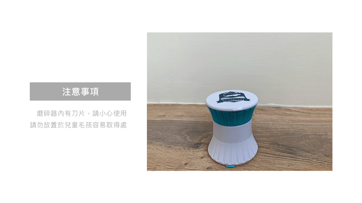 *磨碎器內有刀片,請小心使用,並避免放置於幼童與毛孩容易碰觸的地方。